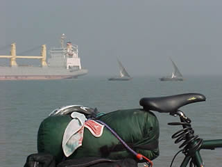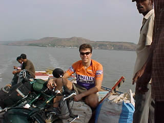 Greetings to all from India. I'm currently in Goa, the small tourist state on the west coast known for its beaches, palm trees, and permanent tourists (hippies), among other things. Weather is beautiful, countryside is beautiful, people are beautiful. Now that the pleasantries are over, lets get down to it! I left Bombay by ferry, crossing the little bay to Rewas in order to start heading south. My first impression of rural India therefore, came with a little concrete jetty stuck out in the mangrove swamps in the middle of nowhere, literally! I've included a pic of it - behind is nothing but fields for miles. Nothing but palm and mango trees, rice paddies, buffalo, and field workers in sari's (the women) and short skirts (the men). For the first 10 miles all I could think was "wow, I'm actually in the sticks in India!". I passed women drying thousands of tiny shrimp on the side of the road (and I mean ON the road), sweeping them up with little brush brooms, along with about 20% extra road dust and leaves. Think I'll pass on the seafood for a while. Cows are everywhere - they are, of course, sacred here. Hence the expression "sacred cow" (meaning road block you can't help move on with a little physical encouragement). I think the sacred cow idea originated around the time litter was first invented, as a method of battling the accumulation of it in the streets. These guys (sorry, I mean ladies - bulls aren't sacred but are harnessed for work here) are natural trash collectors - 'course, they leave behind their own recycled litter for everyone to dodge. This has led to, among other things, the use of liquified cow crap as a method of keeping down the dust on rural patios. No, this is not a joke - when it dries, it makes a pretty smooth mat of (digested) grass over the dirt and dust. Pretty neat, actually, and a whole lot less dusty. Not sure about the hygiene aspect of it, though... I stopped in Alibag, as per the recommendation of a travelling businessman, for my first night and found a wonderful clean little hotel, with cable tv and my own errand boy, for $5. Beat that, Motel 6! (I've paid as low as $2 - see the pics for the quality...) I ended up staying there 3 days, as I started hanging out with the 28yr old owner, Manoj, and his friend and having a great time. They considered me their guest and took me on tours of the whole area, including their families, cattle, farmland and wells, houses, local sights, etc. We exchanged loads of details about each other's cultures during that time: both got married before love (and fully expected to fall in love with their wives through time together, rather than before they made the decision - Manoj's friend had never actually spoken to his wife before he decided to ask for her hand in marriage). Neither wedding was "arranged", however. But both had to receive the permission of the fathers involved. Neither of them could conceive of doing a trip like mine alone, but would require the company of friends or family to do it - in fact, this detail provided a great deal of enlightenment for me. Up until then I had been getting very frustrated at times by the apparent lack of privacy shown by strangers. Stopping in a little village for lunch, I could draw a semi-permanent crowd of 20 or more in about 5 minutes. People would come up and stare, chat about nothing, fiddle with parts of the bike, even practically take books out of my hands to check the titles. After talking to Manoj, I realized that, besides the obvious novelty factor, this curiosity was also an attempt to make me feel less lonely and left-out (in their eyes) than it was an insensitive invasion. To them, a solitary person is just someone who is waiting to feel included by the locals. This was also shown by Manoj having a hard time understanding me wanting to take a break from his hospitality and spend a little time by myself. To him he'd promised to host me, and fully intended to do so EVERY minute of that day. Very interesting - so different from what we grow up with. The countryside here reminds me of what I think eastern Africa must look like - red earth, hot and sunny and dusty, lots of foliage, crappy roads, and tiny villages every few miles. The country is divided into 26 states (according to one local), each of which is divided into regions, which are then divided into districts or somesuch. And each district must have its own schedule and methods of road maintenance, cause no section of road lasts for more than 500 meters without changing completely. In a 1 mile stretch of asphalt, you can go from practically unrideable to smooth as glass and back again multiple times, with varying stages of degeneration in between. Sometimes it was 25 kph of easy rolling, other times I stayed on the dirt shoulder just for comfort. I crossed channels and little rivers using both 4 lane bridges and outrigger canoes - the latter causing me to chain the bike discreetly to the boat, in the event we tipped over! I figured if the boat floated after tipping, I'd save my stuff. If not, my bike sure as hell wasn't gonna float by itself... And the country roads mast have been designed with bullock carts (ie, non-human locomotion) in mind: if there were 20 hills in view, you could bet the road climbed almost to the top of every one of 'em. The towns range from large (by Indian standards) metropolitan areas that look and feel fairly western to 200-people villages with both open sewers and open mouths at the sight of me passing by ("Cykel, cykel!!", is the usual cry from the kids). And there's nothing like seeing a little 'un crapping on the beach to make you watch your step! It feels strange to be touring a country that ranks second in the world in software production, has nuclear weapons capabilities, and has designed its own supersonic jet, but that lacks (according to the government itself) proper water treatment and waste management facilities in so many areas. A recent survey of middle class Indians found t