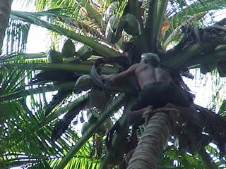 | ...and its attached bathroom. Guess you get what you pay for. (No bedbugs yet, though...). | Acoconut harvester - Manoj said he was 60 & had been doing it for 40 yrs. The rope on his feet had significantly reshaped them! |