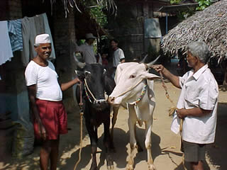 | The farmworkers on Umesh's farm proudly displaying their bullocks. | Manoj, wife, and 9 day old daughter, wrapped up like a burrito. |
