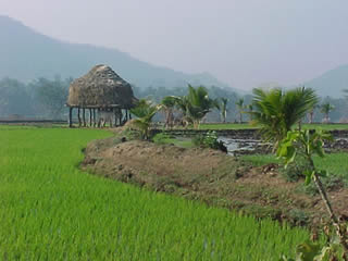 | Umesh, me, and Manoj out in the sticks, where they were showing me rice paddies and reservoirs and bulls and anything they thought might remotely interest me (it all did). | Typical rice paddy - the hut has hay stacked on it for storage. |