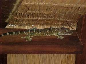 | This guy kept me company in a hut one night - he's about 12-14 inches long and makes a sound like "Gek-kooow!" (appropriately enough). I think they eat chickens. | See Curious George. See George stare at the foreigner while eating. George is curious. | |