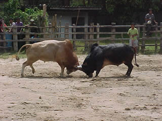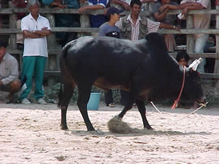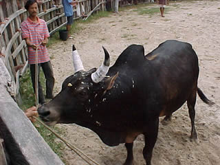 | Thai bullfighting, held once a month. The ropes through the nose ring control them VERY effectively. The stuff on its face is banana, either for luck or as a lubricant for when they butt heads. | Getting ready for battle. |