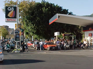 Not much new news actually. Just thought I'd take advantage of the Internet access before I move on tomorrow. Been spending the last few days in a campground in Sferrocavallo near Palermo, Sicily (I think I mentioned that last time). We've (the staffer and other campers) been having a good time basically dinking around, hitting the beach for a little snorkling and sunbathing, eating good food, and hitting the Palermo nightlife. Last night four of us went to a disco and danced the night away to some of the best dance hits from 2 or 3 years ago! The fashion may be cutting edge here (apart from the translucent plastic bra straps) but the regular disco music ain't. Great time, nonetheless. The disco was an old villa restored for the sole purpose of night life - 2 story interior ceiling surrounded by an upper level balcony, pillars all round, well-decorated reception area (!), and marble floors in many places. Absolutely beautiful. The second time the breakers flipped, cutting off the music (and the annoying dj- thank you!), we pretty much knew what to do - keep dancing! They even had a Latin-American drummer to keep the beat going during those dark times. Tomorrow I hit the road again (I think I said this a few days ago) to do a bit more of Sicily before making my way to Greece. I'll miss the Italian food - I found a restaurant here (Il Delfino) that might be featured in global food guides. I know the French know it pretty well. For $15 you get a set 4 course meal with wine (no menu choices) of the specialties of the week. And each course features 2-5 different items, such as squid, boiled octopus, fried fish, lobster, giant shrimp, chili sardines, seafood risotto and maccaroni, spaghetti with clams, whole baked fish, etc, etc, etc. Man, what a feast. But believe it or not, I've gotten tired enough of pasta and pizza to start cooking a few meals of my own, especially anything with eggs (ommlettes!) or beef. Makes a nice change of pace... Local news: the pic is of the local gas situation. Nobody has any! Truckers have blockaded the port and gas stations aren't getting refilled, so voluntary rationing is in effect. Its the topic of the day with everyone including the tourists, but because I'm on a bike, I didn't even realize it until I saw the lines. Vive le bicce! Ciao, tutti! Mark |