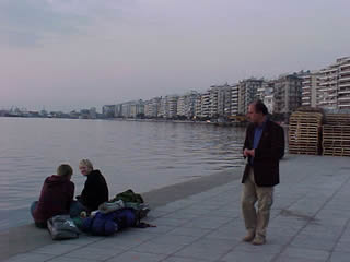 I'm currently in Thessaloniki, the 3rd largest city in Greece, enjoying a day's break from the road by eating greasy food (imagine that!) and watching an American movie with Greek subtitles. Sitting here in an ultra-modern Internet cafe, I'm surrounded by rabid (and I mean RABID!) soccer fans watching the big-screen game and screaming at their team, all trying desperately to drown out the already loud stereo, while I try to compose my thoughts in some coherent manner. Rots of ruck... Speaking of greasy food, I weighed myself on some scales in the Athens train station - I've GAINED 2 pounds since setting out on this deal. Gotta get to a country quick where meat and olive oil don't figure so big in the cuisine. I ate a couple of Chinese meals in Athens - it was a nice break, but I still couldn't get away from the salt level. It ranks right behind feta cheese as the most used condiment here. Thessaloniki is a coastal city in the Northwest of the country, halfway between Athens and Istanbul, as the bike rides. It dates back to 315BC and is named after Alexander the Great's sister. Beautiful place, it also has a very modern flavor, owing to a massive fire in 1917 that destroyed much of the city, and then an earthquake in 1978 that damaged most of the monuments and churches. The White Tower, pictured below, was the scene of a massacre of the Sultan's personal guards who'd revolted against Mahmoud II and were imprisoned here in 1826. It became known as Bloody Tower because of this, and the turks decided to suppress it by whitewashing and renaming it the White Tower. I got here from Athens by taking the train for the first half of the journey here, in order to save a little time. This got me back up to approximately the longitude I'd started at in Greece (so I'm not REALLY cheating, ok?), and then I rode the second half into Thessaloniki at a record pace for me (a screaming 23 kph average!) If I keep this pace up, I should be done by, oh I don't know, May? I got so used to the hard, hard 60 km days in the Greek mountains that the 90+ km days of this week have been a shock. I think I'll be out of Greece and into Turkey within a week if all goes well, which is only a week longer than what I'd thought I'd take in Greece anyway. This city is really fashionable - the waterfront cafes are simply packed with all the beautiful people in the evening - and this suits me just fine, although only by coincidence. I'd decided after having walked around the previous place on a Saturday evening, that I was tired of looking like such an obvious damn tourist in my shorts and sandals. NO Greeks wear shorts or sandals in November! (Not even other tourists for that matter, but then they aren't from Montana and traveling by bike!) I mean I get looks from people sometimes that make me wanna check the mirror to make sure somebody didn't slip Hawaiian-print bermuda shorts and calf-high black socks on me when I wasn't looking. And nylon hiking pants and a nappy fleece jersey aren't much more stylish. I can't believe I actually went to a Sicilian nightclub wearing that stuff. So tomorrow I'm going shopping for shoes, jeans, a shirt and matching (matching!) jacket - something I can wear out at night and not have people automatically speak English to me. Or look at me like I've insulted their heritage and offended their eyesight just by dressing like that in their presence. Where I'll store the new stuff on the bike I haven't decided yet. I've been making a list of less-used items that I can mail back or just plain not carry in order to make room. Like food and water (yes, I'm that desperate). So, we'll see what I can find in the shops tomorrow. Of course with my fashion sense, its likely to be very expensive Hawaiian-print bermuda shorts with dark socks... Though speaking of good taste, its not too uncommon for me to see a young woman wearing an outfit that might include TIGHT dark purple nylon pants and maroon leather jacket garnished with a pinkish scarf. It looks a bit like a slender eggplant wearing a pink wig being being slowly squeezed into a can of grape Nehi. (Aaw, hell, its the best I could come up with - you'd have to see it...) On the train from Athens, I got into a conversation with a young Greek girl and, as we had 6 hours to blow, we covered a load of different philosophical terrain, ranging from materialism to politics to America's global role. I'm fascinated by the opinions of non-Americans on how America involves itself in the world, or at least on how they perceive us to be involved. Since other country's opinions, especially when about us, don't usually get much air time at home, up to now I'd only heard bits and pieces in that vein regarding our role in Yugoslavia. I knew that our military involvement wasn't necessarily popular worldwide, but its still an eye-opener to speak directly with someone who believes that America was in the wrong. I happen to disagree with her, but it was very interesting to hear that sentiment expressed, and surprising to see how strongly she felt it. I'm continuing my current trend of staying in the worst (read: cheapest) possible hotel I can find in any town, particularly now that the weather is starting to get damn cold for camping. I mean I can hardly take my shirt off during the day anymore - how'm I gonna maintain my tan? And I could've sworn I saw a cloud behind me out of the corner of my eye this afternoon. But by the time I turned around for a better look, it had evaporated. So my place for tonight, and probably for tomorrow night unless the rats carry me off, costs $11. This isn't much more than for camping, and I get the added security of a locked room for my stuff while I ramble around. It might be a false sense of security however, as just about every room I've taken in the past month uses the same simple key, I swear. This place is such a hole that after the owner quoted me $16 for a night, he almost immediately came down in price without me even having to bargai